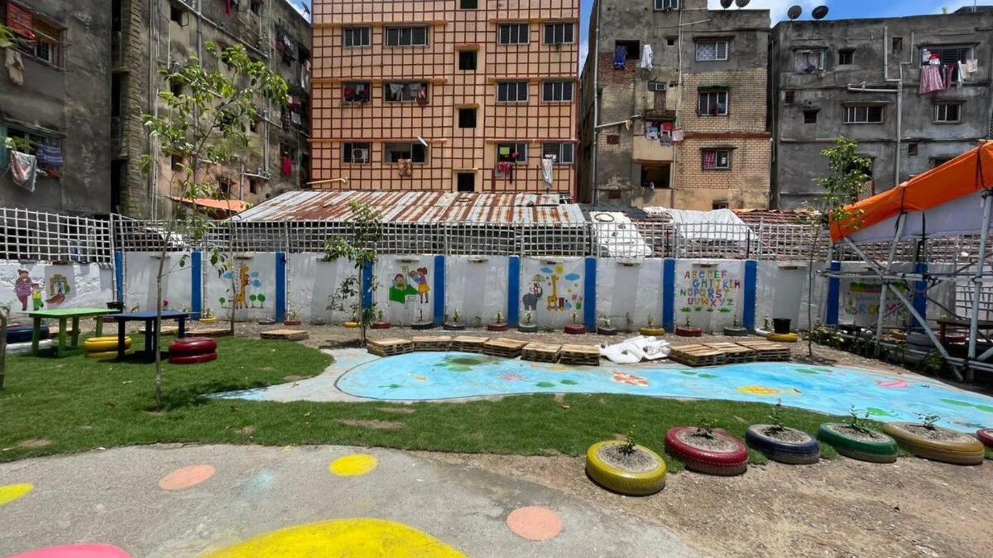 Dit kleurrijke, groene plein ligt in een sloppenwijk van Kolkata, India. De wijk kent geen gecentraliseerde afvalinzameling en door de overbelaste, smalle wegen is het gebied onbereikbaar voor gemeentepersoneel.